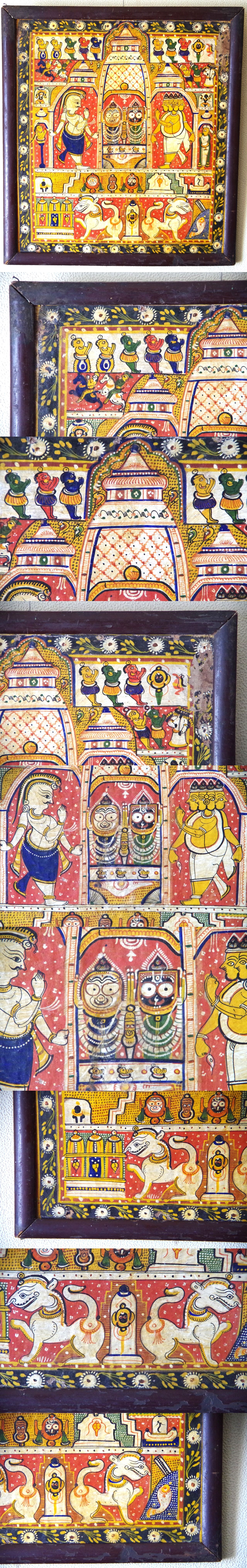 迫力のある古典的な構図で、天蓋の下にジャガンナート、スバドラー、バララーマが大きく描かれ、 足元に小さくヒンドゥの神々、下段に供物を捧げるバラモン僧或いは巡礼者が描かれています。